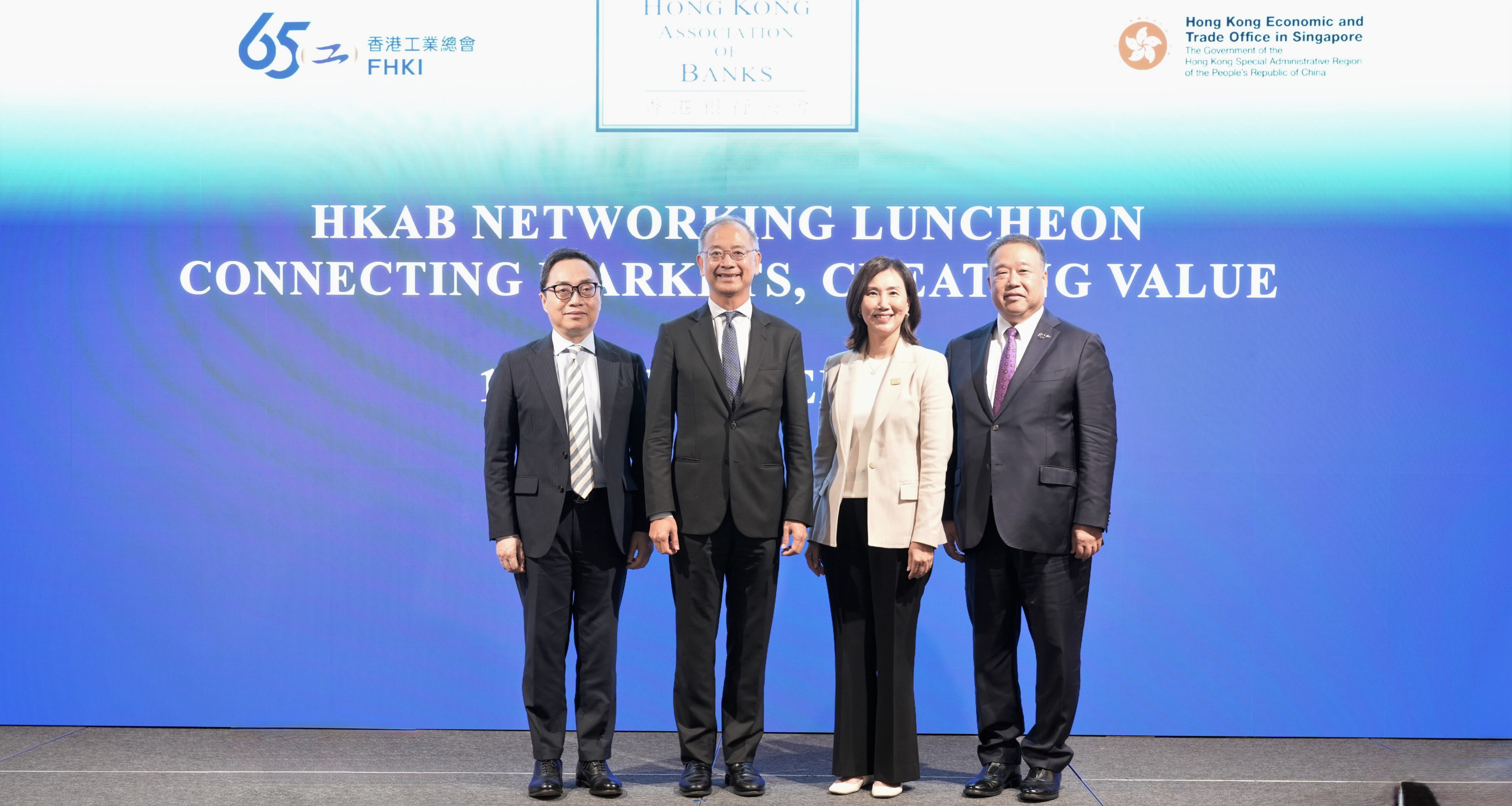 圖片說明:(左起)香港駐新加坡經濟貿易辦事處處長馮浩然先生、香港金融管理局總裁余偉文先生、香港銀行公會主席禤惠儀女士及香港工業總會主席林世豪先生於越南商務午餐交流會上合照。